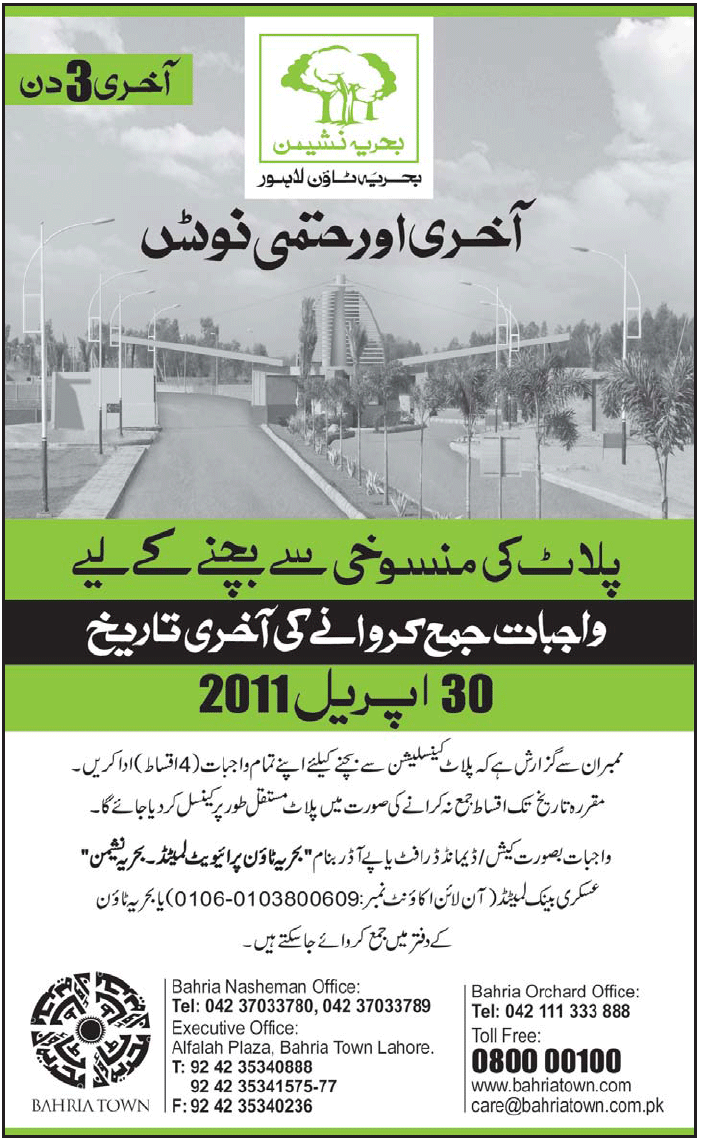 Bahria Town advertised for Bahria Nasheman Lahore last and final notice for payable dues. Members are warned to paid up to 4 installment till 30th April, 2011 to avoid cancellation of their plot.