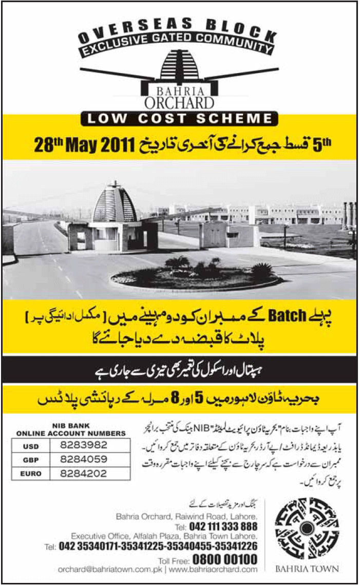5th Installment payment notice published by Bahria Town Lahore in today’s Daily Urdu Jang for Bahria Orchard Lahore Low Cost Scheme Overseas Block.