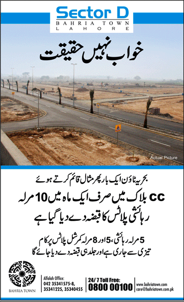 Bahria Town announced partial possession for Sector D in CC Block. Ad was published in Daily Urdu Jang as on November 02, 2011. Also it is not stated that possession given for complete CC block or for few lines or plot of CC block. Please contact Bahria Town office directly for more information.