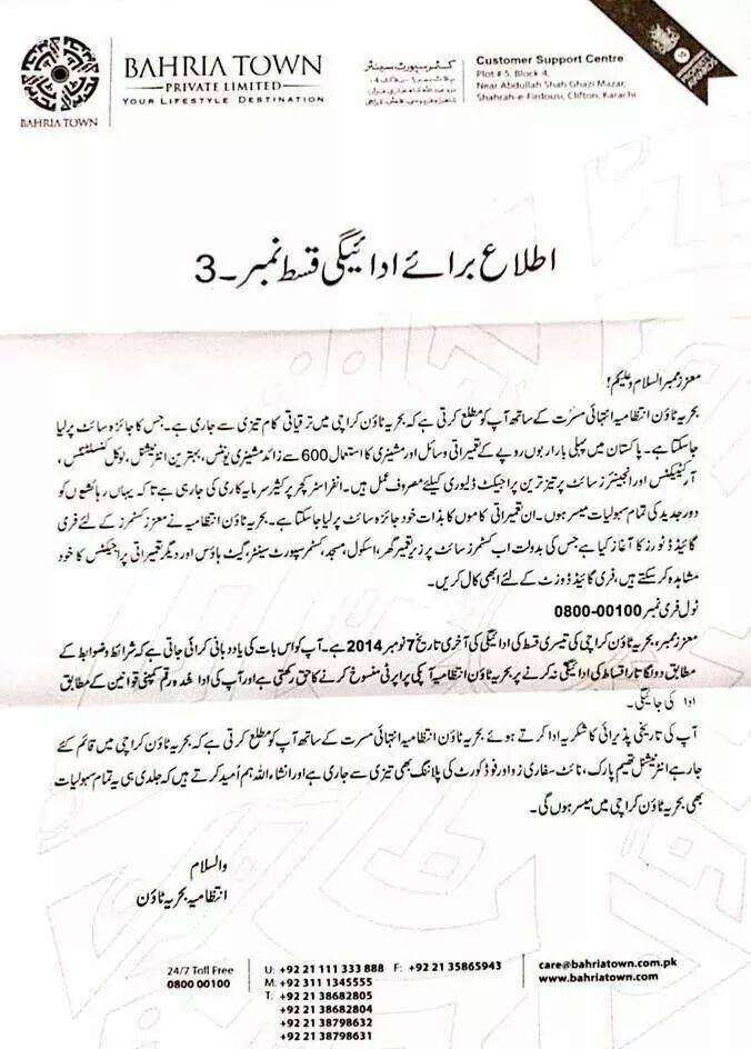 Notice for the payment of 3rd installment has been issued to allottees of Bahria Town Karachi project. It also reminded that Bahria Town management has right to cancel files which are short of two consecutive installments. Members are requested to pay their installment at their earliest to avoid any such cancellation.