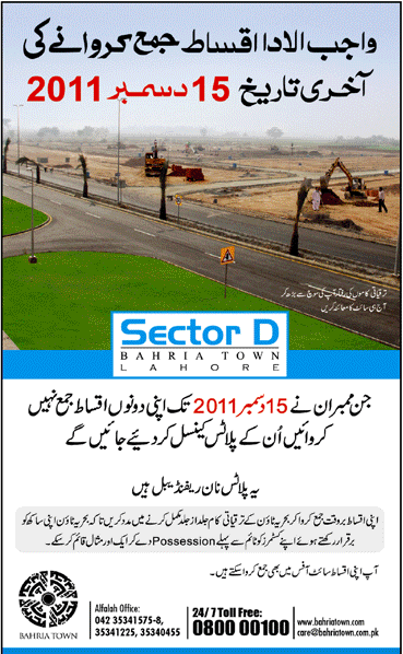 Bahria Town Lahore Sector D Instalment Payment Notice