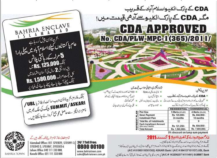 Bahria Town offer 5 Marla plot booking for Bahria Enclave Islamabad.
