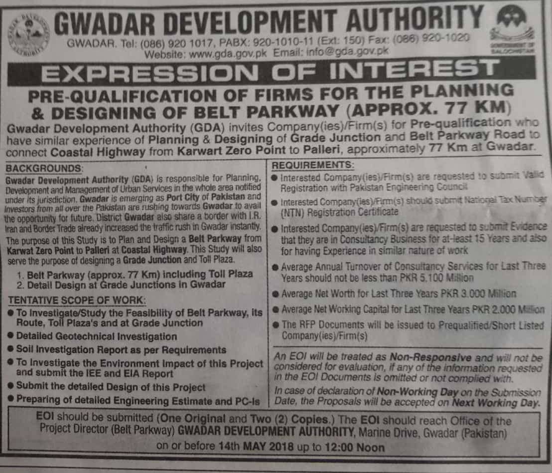 Gwadar Development Authority invites companies / firms for pre-qualification of planning and design of Belt Parkway road to connect Coastal Highway from Karwat Zero Point to Palleri, approximately 77 KM at Gwadar.