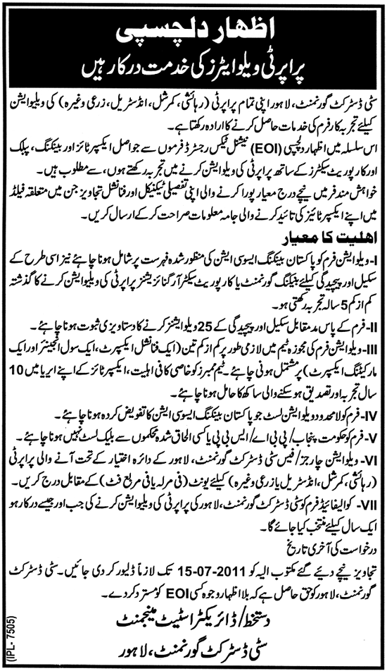 City District Government Lahore Required Property Valuaters to valuate all of its Commercial, Residential, Industrial and Agriculture Properties.
