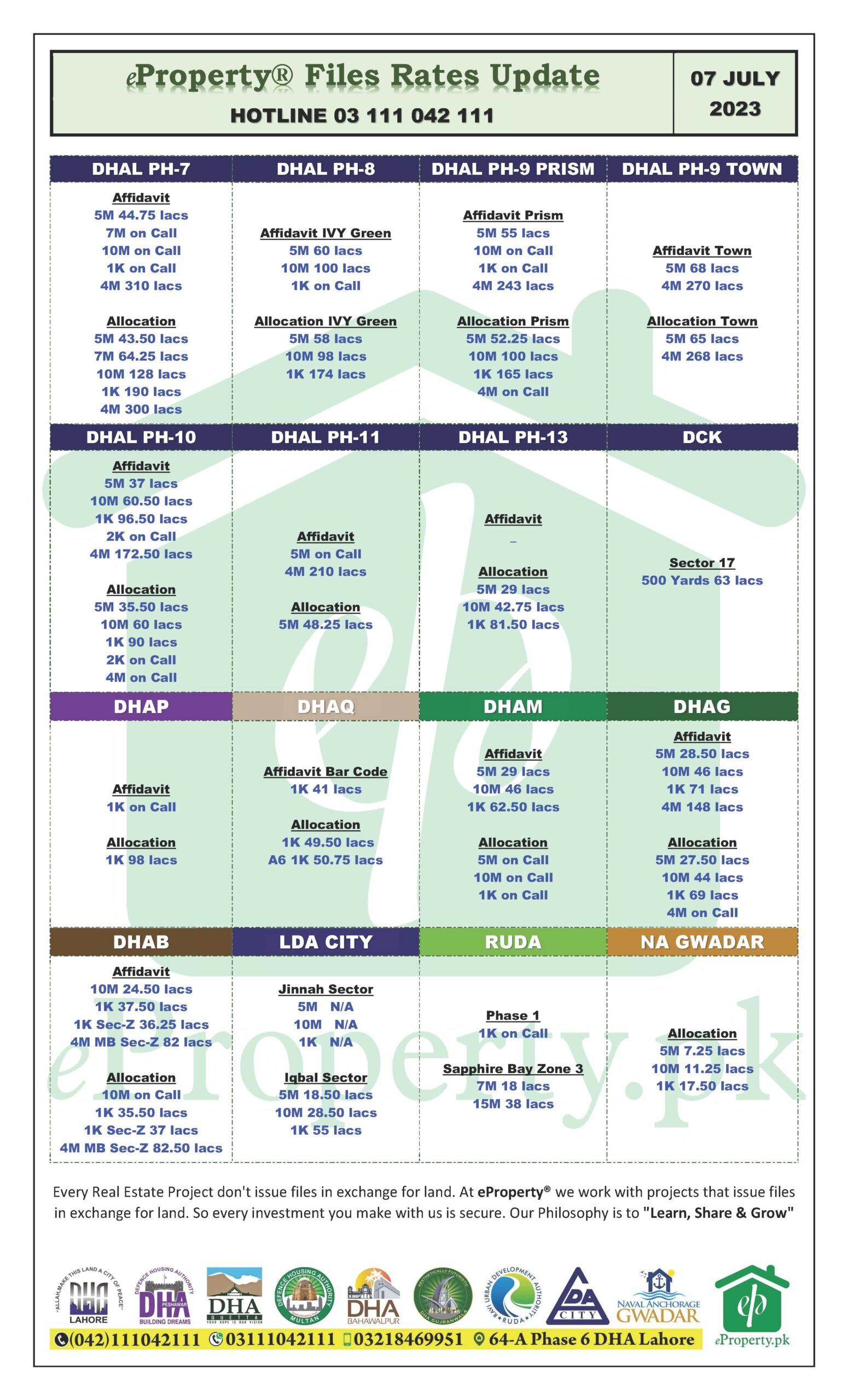 eProperty daily files rates update for DHA Lahore, DHA Karachi, DHA Peshawar, DHA Quetta, DHA Multan, DHA Gujranwala, DHA Bahawalpur, RUDA, LDA City and Naval Anchorage Gwadar as on 07 July 2023.