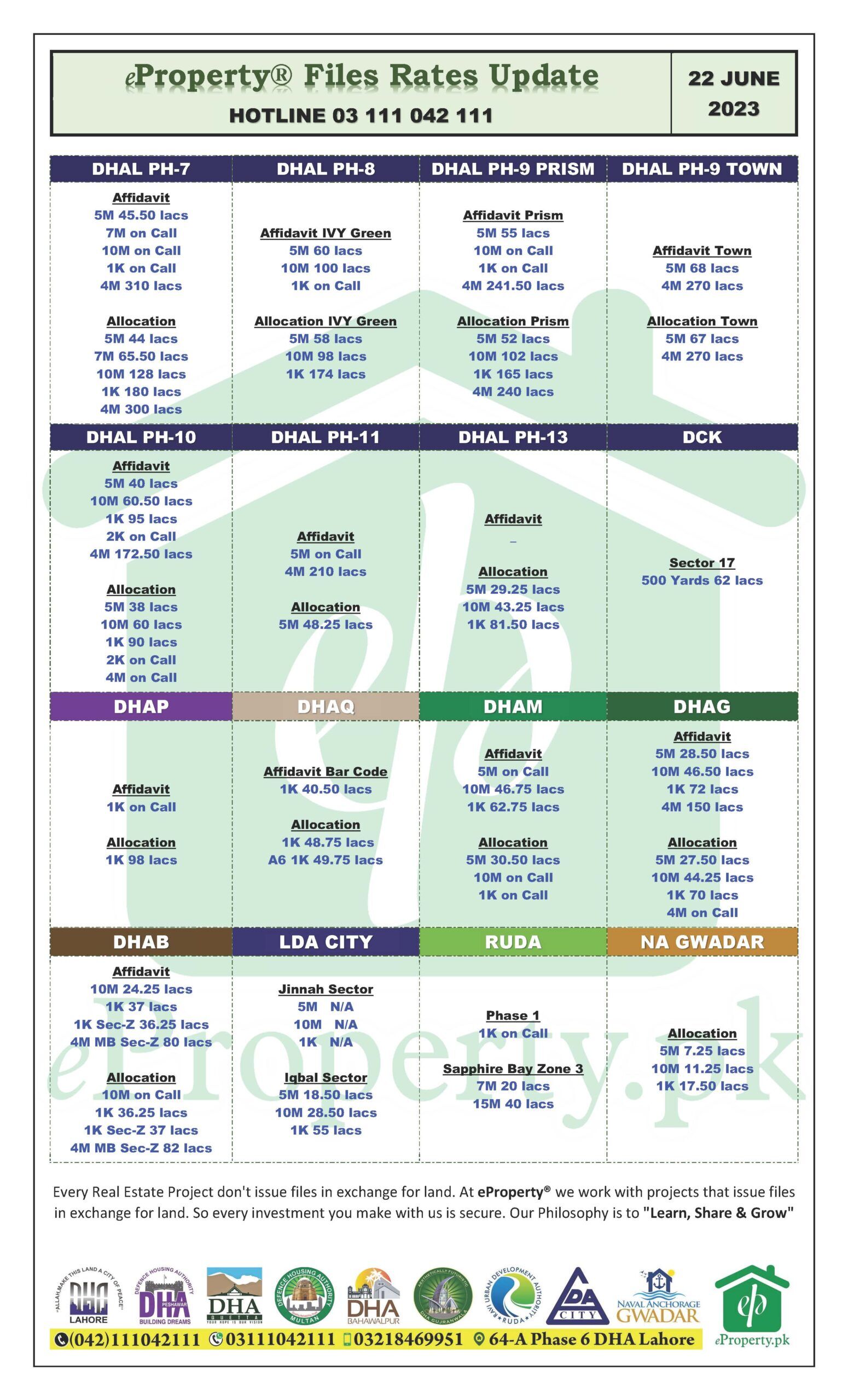 eProperty daily files rates update for DHA Lahore, DHA Karachi, DHA Peshawar, DHA Quetta, DHA Multan, DHA Gujranwala, DHA Bahawalpur, RUDA, LDA City and Naval Anchorage Gwadar as on 22 June 2023.