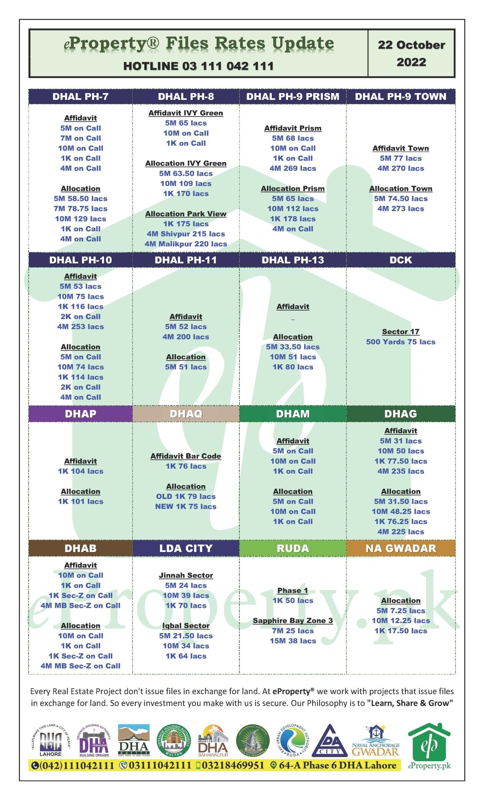 eProperty daily files rates update for DHA Lahore, DHA Karachi, DHA Peshawar, DHA Quetta, DHA Multan, DHA Gujranwala, DHA Bahawalpur, RUDA, LDA City and Naval Anchorage Gwadar as on 22 October 2022.