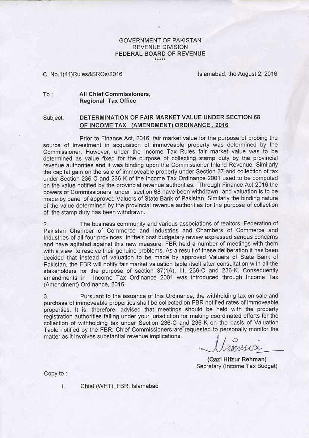 Determination of fair market value under section 68 of Income Tax (Amendment) Ordinance , 2016