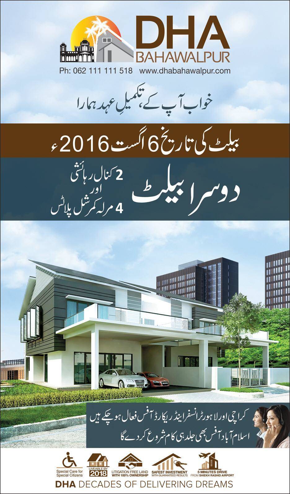 DHA Bahawalpur 2 Kanal & 4 Marla Commercial Plots Ballot will be held on 6 August, 2016