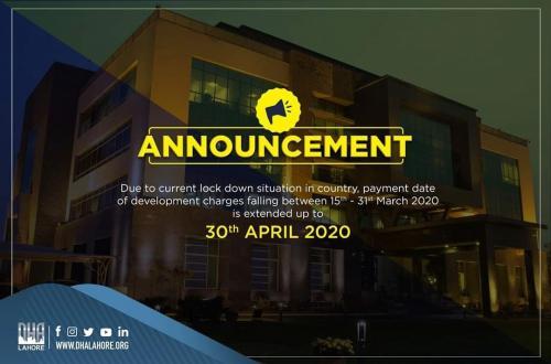 DHA Lahore Extended Development Charges Date up to 30th April 2020