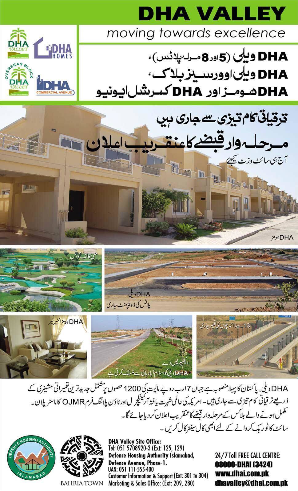 Defence Housing Authority (DHA) Islamabad announced partial possession for DHA Valley 5 & 8 Marla Plots Islamabad, DHA Valley Overseas Block Islamabad, DHA Homes Islamabad and DHA Commercial Avenue Islamabad soon.