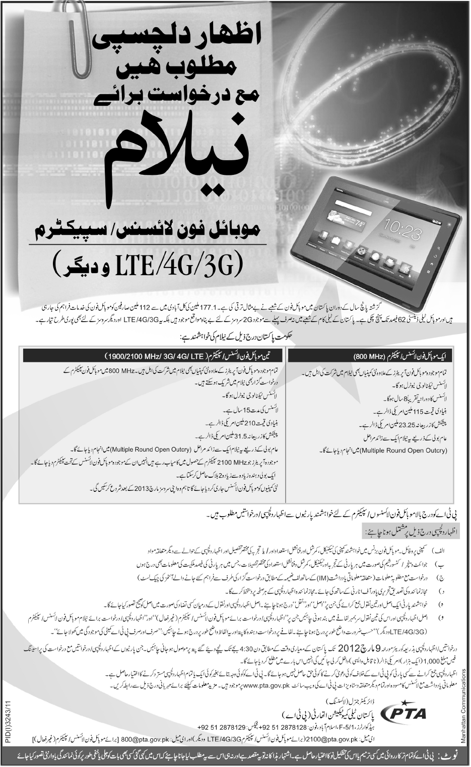 Expression of Interest for auction of 3G-4G-LTE License in Pakistan
