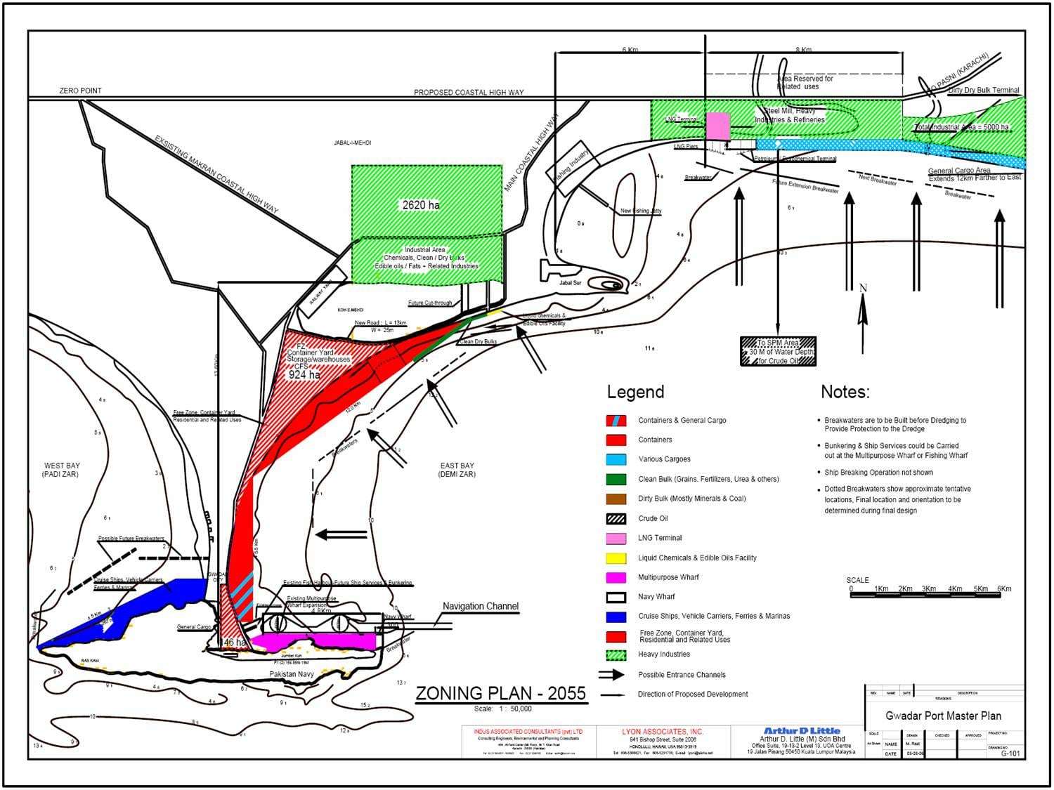 Based on a thorough economic and industrial analysis, shipping trends analysis and long term forecasting study (undertaken by Arthur D. Little), a master plan for the development of Gwadar Port was developed and adopted in 2006. The plan uses a planning horizon of fifty years. The outlook plan for 2055 envisions a total quay-length of 50 km, a total throughput volume of 300-400 million tons of cargo and a port land area of about 10,000 hectares.