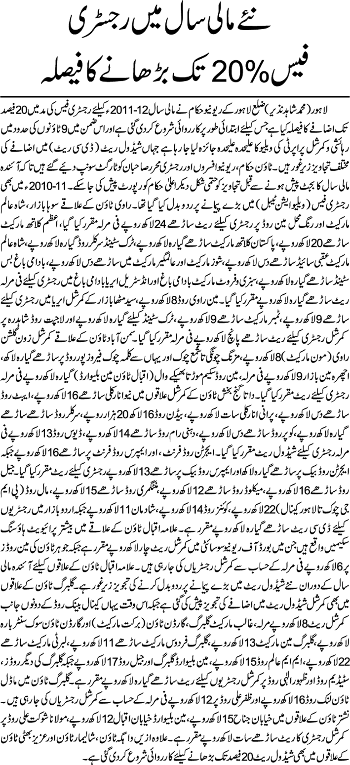 Revenue Department Lahore decided to increase DC Rates for Major Commercial areas of Lahore to get 20% more revenue in terms of registry.