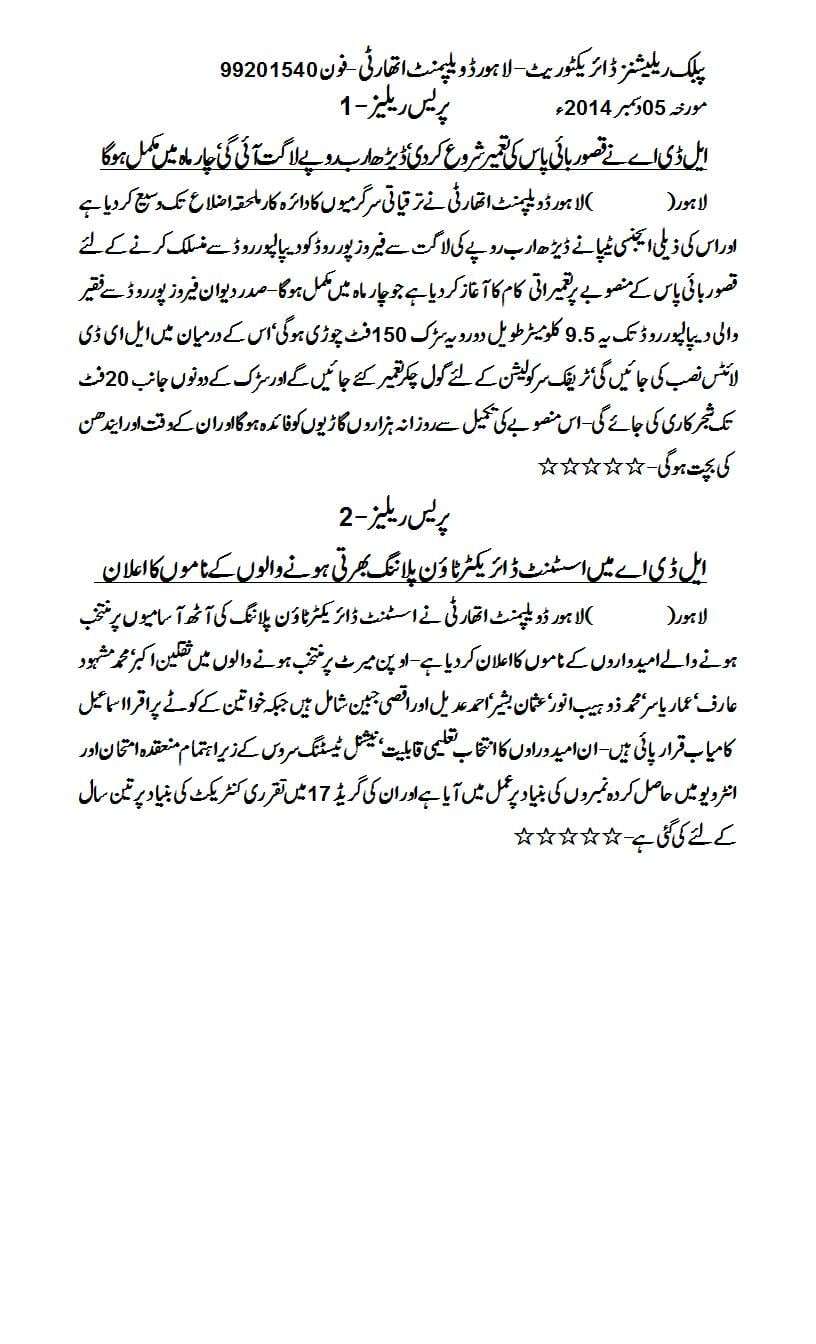Lahore December 05, 2014: Lahore Development Authority has extended its development activities to the adjoining districts of Lahore and started execution of Kasur Bypass project which will be completed at a cost of Rs. 1.5 billion within four months.