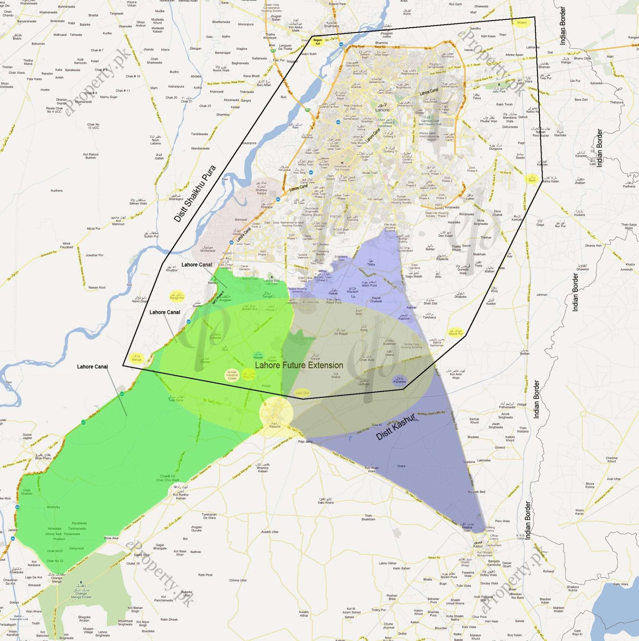 Lahore Future Extension (projected). This projection is based on previous extension trend of Lahore City from out side Historical Walled City of Lahore. Lahore Canal Road is dividing Lahore City into two parts. Lahore was extending on both sides of Lahore Canal Road. This trend continues and we saw developments in the same direction along with Lahore Canal.