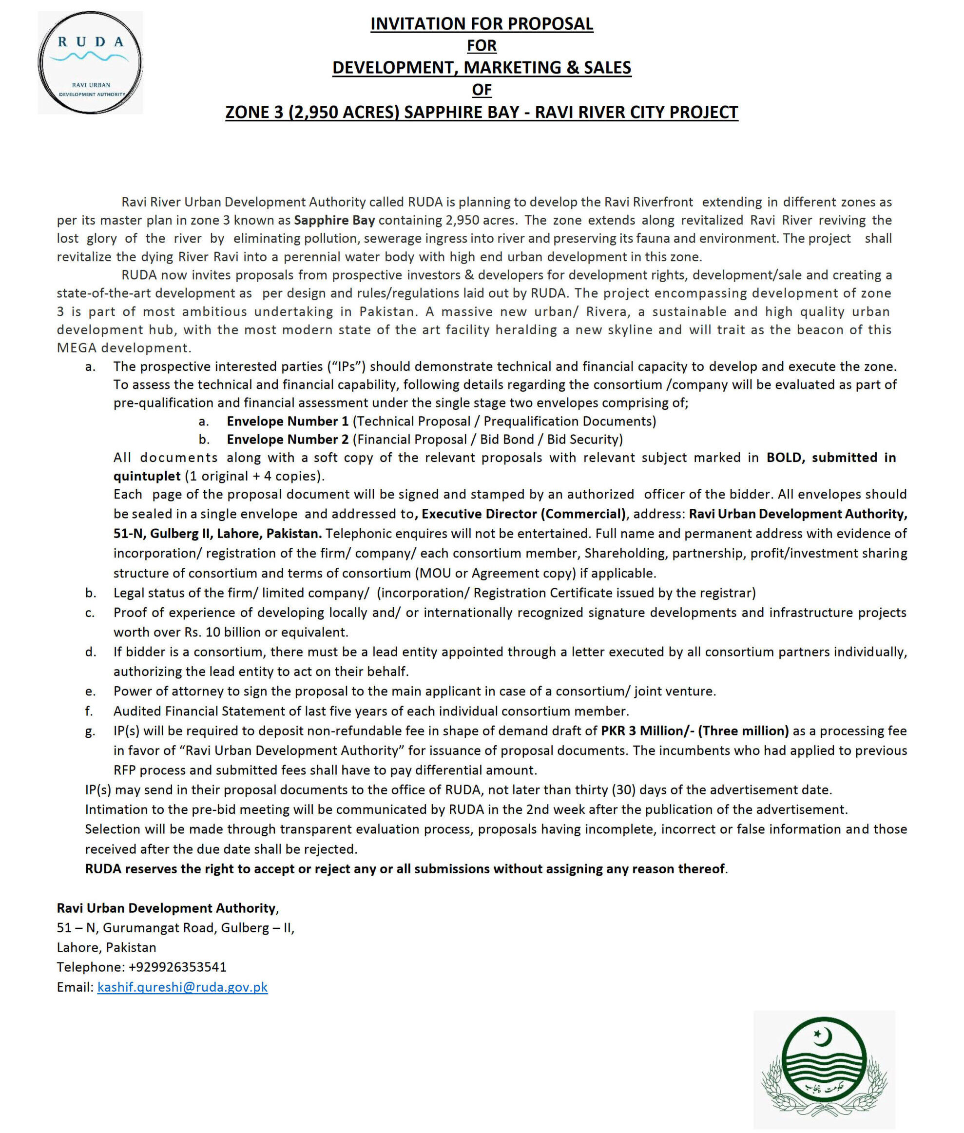 “We have completed the bidding process for awarding/granting rights of developing the phase-1 (2,000 acres / Sapphire Bay Ravi City Lahore) of the project. The formal announcement about the successful bidder will be made on Monday or Tuesday (May 31 or June 1),” RUDA’s Chief Executive Officer Imran Ameen