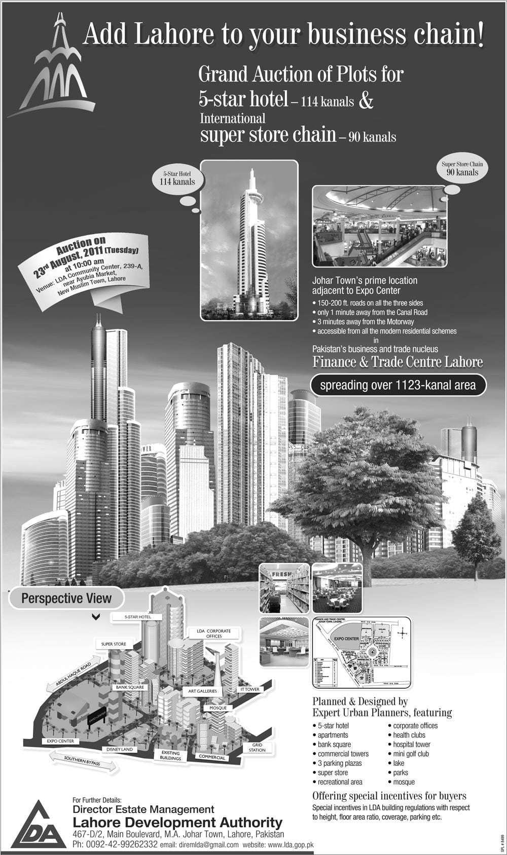 Lahore Development Authority (LDA) announced plot auction at Finance & Trade Center Lahore for 5 Start Hotel of 114 Kanals area, and for Super Store Chain of 90 Kanals.