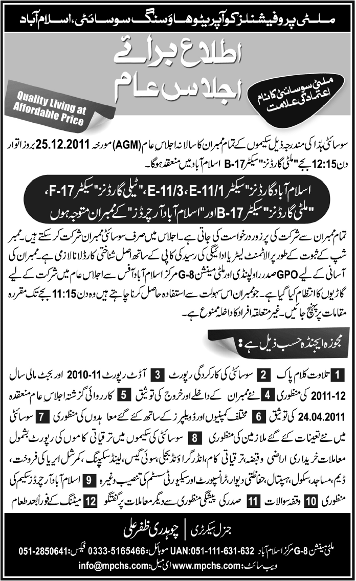Multi Professional Cooperative Housing Society (MPCHS) Islamabad Annual Meeting Notice.