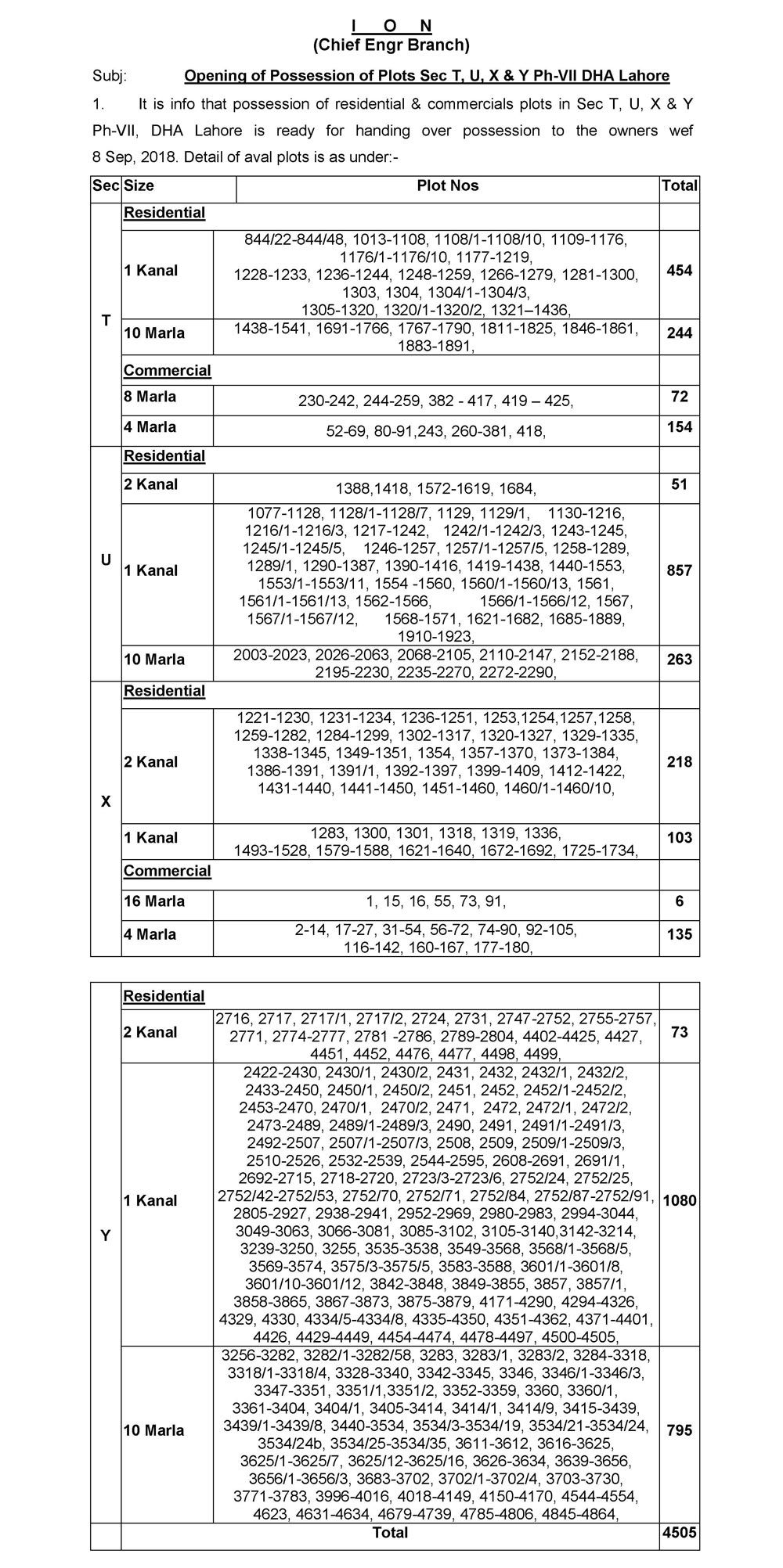 DHA Management announced opening of possession for DHA Phase 7 Lahore Sector T, U, X & Y for following residential and commercial plots: