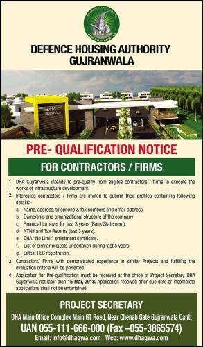 Pre Qualification Notice for Contractors Firms DHA Gujranwala