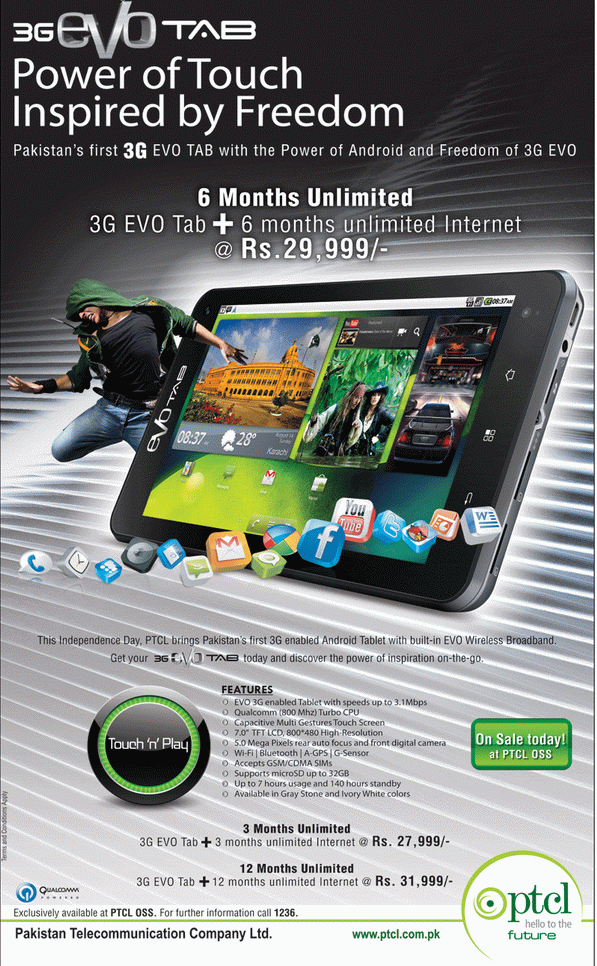 Pakistan Telecommunication Company Limited (PTCL) on the 65th Independence Day of Pakistan announced the launch of the country’s first 3G-enabled tablet computer with built-in EVO wireless broadband connection.