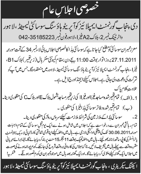 Punjab Government Employees Cooperative Housing Society Lahore Meeting Notice