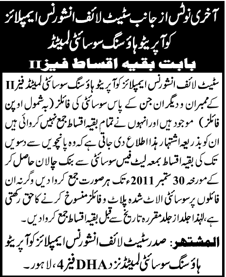 State Life Lahore Phase II management published full and final payment notice for due instalments. Members are requested to make payment till September 30th, 2011 to avoid plot cancellation.