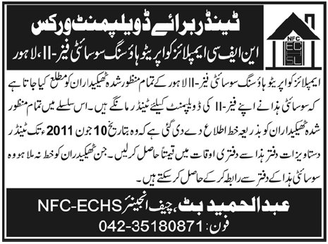 Tender notice for NFC Phase 2 Lahore Development Works was published in today’s Daily Urdu Jang dated 27-05-2011.